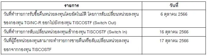 บริษัทหลักทรัพย์จัดการกองทุน ทิสโก้ จำกัด (“บริษัทจัดการ”) ในฐานะบริษัทจัดการของกองทุนเปิด ทิสโก้ โกลบอล อินคัม พลัส ชนิดรับซื้อคืนโดยอัตโนมัติ (TGINC-R) ขอเรียนแจ้งให้ผู้ถือหน่วยลงทุนทุกท่านทราบว่า บริษัทจัดการจะดำเนินการรับซื้อคืนหน่วยลงทุนโดยอัตโนมัติ โดยการสับเปลี่ยนหน่วยลงทุนของผู้ถือหน่วยลงทุนทุกราย ไปยังกองทุนเปิด ทิสโก้ พันธบัตรระยะสั้น (TISCOSTF) ในอัตราหน่วยลงทุนละ 0.113 บาท ให้แก่ผู้ถือหน่วยลงทุนที่มีชื่อปรากฏอยู่ในทะเบียนหน่วยลงทุน ณ วันที่ 6 ตุลาคม 2566 โดยมีกำหนดการที่เกี่ยวข้องดังต่อไปนี้