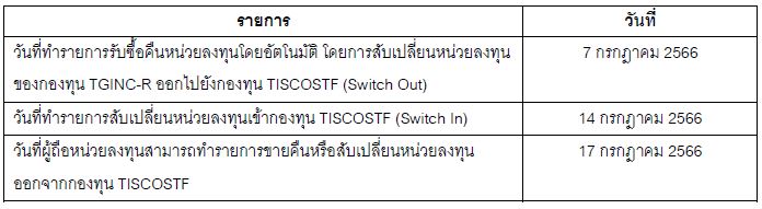 บริษัทหลักทรัพย์จัดการกองทุน ทิสโก้ จากัด (“บริษัทจัดการ”) ในฐานะบริษัทจัดการของกองทุนเปิด ทิสโก้ โกลบอล อินคัม พลัส ชนิดรับซื้อคืนโดยอัตโนมัติ (TGINC-R) ขอเรียนแจ้งให้ผู้ถือหน่วยลงทุนทุกท่านทราบว่า บริษัทจัดการจะดำเนินการรับซื้อคืนหน่วยลงทุนโดยอัตโนมัติ โดยการสับเปลี่ยนหน่วยลงทุนของผู้ถือหน่วยลงทุนทุกราย ไปยังกองทุนเปิด ทิสโก้ พันธบัตรระยะสั้น (TISCOSTF) ในอัตราหน่วยลงทุนละ 0.113 บาท ให้แก่ผู้ถือหน่วยลงทุนที่มีชื่อปรากฏอยู่ในทะเบียนหน่วยลงทุน ณ วันที่ 7 กรกฎาคม 2566 โดยมีกำหนดการที่เกี่ยวข้องดังต่อไปนี้