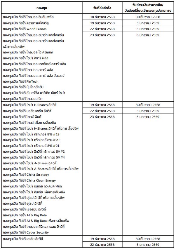 ตามที่ ในวันที่ 24 – 29 ธันวาคม 2568 เป็นวันหยุดของหลายประเทศ ซึ่งจะส่งผลต่อการชำระราคาหลักทรัพย์และการคำนวณมูลค่าทรัพย์สินสุทธิของกองทุน ดังนั้น บริษัทหลักทรัพย์จัดการกองทุน ทิสโก้ จำกัด (“บริษัทจัดการ”) ขอแจ้งวันชำระเงินค่าขายคืนหน่วยลงทุนและวันทำรายการสับเปลี่ยนหน่วยลงทุนเข้ากองทุนปลายทางของกองทุนรวมต่างประเทศที่ได้รับผลกระทบจากวันหยุดดังกล่าว ดังต่อไปนี้