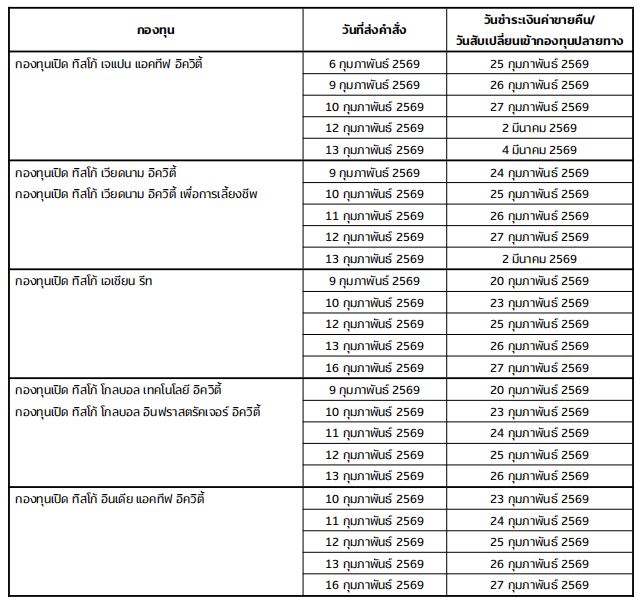 ตามที่ ในวันที่ 16 – 23 กุมภาพันธ์ 2569 เป็นวันหยุดของหลายประเทศ ซึ่งจะส่งผลต่อการชำระราคาหลักทรัพย์และการคำนวณมูลค่าทรัพย์สินสุทธิของกองทุน ดังนั้น บริษัทหลักทรัพย์จัดการกองทุน ทิสโก้ จำกัด (“บริษัทจัดการ”) ขอแจ้งวันชำระเงินค่าขายคืนหน่วยลงทุนและวันทำรายการสับเปลี่ยนหน่วยลงทุนเข้ากองทุนปลายทางของกองทุนรวมต่างประเทศที่ได้รับผลกระทบจากวันหยุดดังกล่าว ดังต่อไปนี้