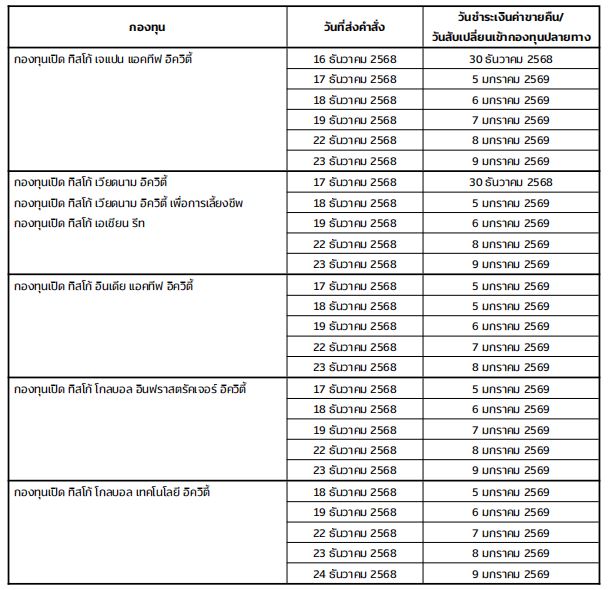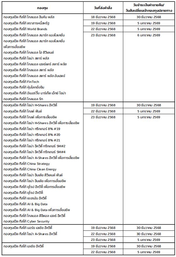 ตามที่ ในวันที่ 24 – 29 ธันวาคม 2568 เป็นวันหยุดของหลายประเทศ ซึ่งจะส่งผลต่อการชำระราคาหลักทรัพย์และการคำนวณมูลค่าทรัพย์สินสุทธิของกองทุน ดังนั้น บริษัทหลักทรัพย์จัดการกองทุน ทิสโก้ จำกัด (“บริษัทจัดการ”) ขอแจ้งวันชำระเงินค่าขายคืนหน่วยลงทุนและวันทำรายการสับเปลี่ยนหน่วยลงทุนเข้ากองทุนปลายทางของกองทุนรวมต่างประเทศที่ได้รับผลกระทบจากวันหยุดดังกล่าว ดังต่อไปนี้