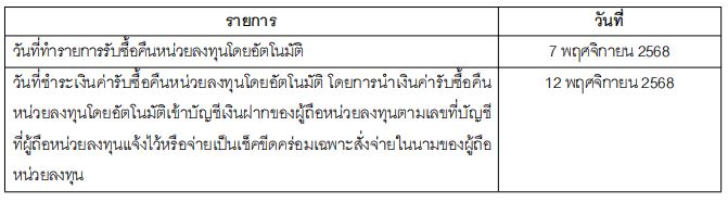 หมายเหตุ: บริษัทจัดการจะหยุดรับคำสั่งซื้อ/ขายคืน/สับเปลี่ยนหน่วยลงทุนของกองทุน TCINCP-R ในวันที่ 7 พฤศจิกายน 2568