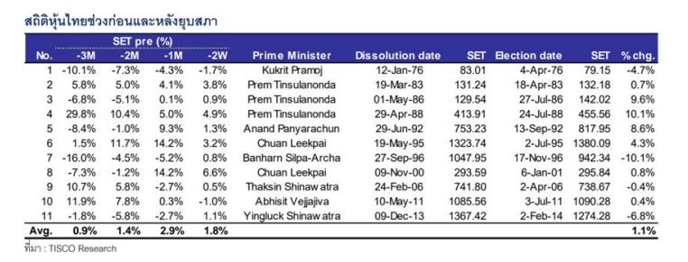หากย้อนดูข้อมูลในอดีต จะพบว่าตลาดหุ้นไทยไม่ได้ตอบสนองในทางลบต่อความไม่แน่นอนทางการเมืองเสมอไป โดยความเคลื่อนไหวของตลาดหุ้นไทย ช่วงก่อนและหลังยุบสภาตอบสนองแตกต่างกันทั้งบวกและลบ แต่หลังจากยุบสภาไปจนถึงมีการเลือกตั้งใหม่จะพบว่าตลาดให้ผลตอบแทนเฉลี่ยเป็นบวก และปรับเพิ่มขึ้นถึง 7 จาก 11 ครั้ง ซึ่งถือเป็นสถิติที่น่าสนใจและสะท้อนว่าความไม่แน่นอนทางการเมืองอาจไม่ใช่ตัวถ่วงตลาดในระยะยาว