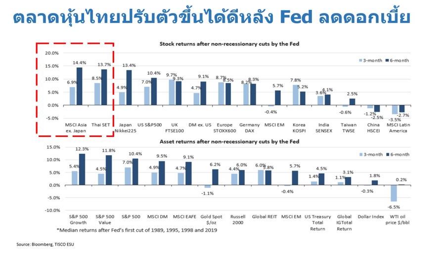 จากสถิติในอดีตพบว่า ในรอบการลดดอกเบี้ยของ Fed ที่ไม่ได้เกิดจากภาวะเศรษฐกิจถดถอย เช่นในปี 1995, 1998, 1999 และ 2019 ตลาดหุ้นไทยสามารถปรับตัวเพิ่มขึ้นได้โดดเด่นทั้งในช่วง 3 เดือนและ 6 เดือนหลังการลดดอกเบี้ย สะท้อนให้เห็นว่าตลาดหุ้นไทยตอบรับเชิงบวกต่อสภาพแวดล้อมดอกเบี้ยต่ำ