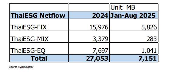 ส่วนในปีนี้ช่วงเดือนมกราคมถึงสิงหาคม 2025 กองทุน ThaiESG มีเงินลงทุนสุทธิรวม 7,151 ล้านบาท โดยเม็ดเงินที่ไหลเข้ากองทุนที่มีนโยบายหุ้นล้วนอยู่ที่ 1,041 ล้านบาท ซึ่งอย่างน้อยหากเม็ดเงินที่ไหลเข้าในกองทุนที่มีนโยบายลงทุนในหุ้นในปีนี้ใกล้เคียงกับปีที่แล้ว ก็เท่ากับว่าในช่วงที่เหลือของปีจะมีเม็ดเงินไหลเข้าตลาดหุ้นไทยเพิ่มเติมอีกราว 6,000 ล้านบาท นอกจากนี้ กองทุน ThaiESGX ซึ่งเป็นกองทุนลดหย่อนภาษีใหม่ซึ่งเปิดให้นักลงทุนเข้าลงทุนได้ในช่วงกลางปีที่ผ่านมายังสามารถสร้างผลตอบแทนได้ดี ทำให้อาจเป็นแรงจูงใจให้กับนักลงทุนลงตัดสินใจลงทุนในกองทุน ThaiESG ที่มีนโยบายลงทุนในหุ้นเพิ่มขึ้น ซึ่งถือเป็นอีกหนึ่งแรงหนุนให้กับตลาดหุ้นไทยในช่วงที่เหลือของปี