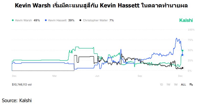 โดยตอนนี้ การตัดสินใจแต่งตั้งประธาน Fed คนใหม่จะขึ้นอยู่กับประธานาธิบดี Donald Trump และคาดว่าในช่วงเร็วคือก่อนเทศกาลคริสต์มาสปีนี้หรือช้าที่สุดคือต้นปีหน้า เราก็จะได้ทราบว่าประธาน Fed คนต่อไปจะเป็น Kevin Warsh หรือ Kevin Hassett หรือ Trump จะสร้างความประหลาดใจอีกครั้งด้วยการตั้งรายชื่อที่อยู่นอกเหนือความคาดหมายขึ้นมาแทน
