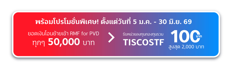 1. สงวนสิทธิ์สำหรับลูกค้าบุคคลธรรมดาที่มีการโอนย้ายเงินจากกองทุนสำรองเลี้ยงชีพ (PVD) มายังกองทุนรวมเพื่อการเลี้ยงชีพที่รับโอนเงินจากกองทุนสำรองเลี้ยงชีพ (RMF for PVD) และโอนย้าย RMF for PVD จากบลจ.อื่น มายังบลจ.ทิสโก้ ตั้งแต่วันที่ 5 ม.ค. – 30 มิ.ย. 2569 เท่านั้น โดยลูกค้าที่มียอดโอนย้ายเข้า RMF for PVD ทุกๆ 50,000 บาทจะได้รับหน่วยลงทุนกองทุนเปิด ทิสโก้ สแตรทิจิก ฟันด์ ชนิดหน่วยลงทุน A (TISCOSTF) มูลค่า 100 บาท สูงสุด 2,000 บาท/ท่าน