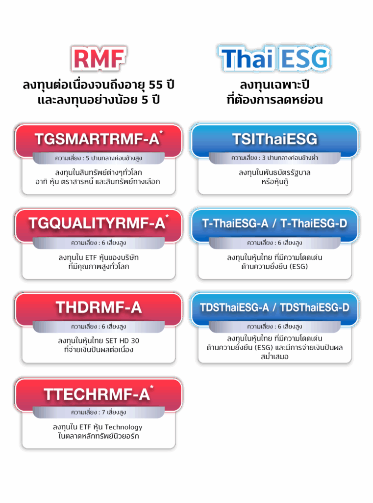 • ผู้ลงทุนควรทำความเข้าใจลักษณะสินค้า เงื่อนไขผลตอบแทนความเสี่ยง และศึกษาข้อมูลเกี่ยวกับสิทธิประโยชน์ทางภาษีที่ระบุไว้ในคู่มือการลงทุนของกองทุนรวม Thai ESG/RMF ก่อนตัดสินใจลงทุน กรณีไม่ได้ปฏิบัติตามเงื่อนไขทางภาษี จะไม่ได้สิทธิประโยชน์ตามเงื่อนไขของกองทุน