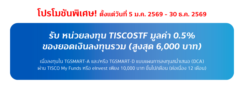- สงวนสิทธิ์สำหรับลูกค้าบุคคลธรรมดาที่มียอดเงินลงทุนในกองทุน TGSMART-A และ/หรือ TGSMART-D แบบแผนการลงทุนสม่ำเสมอ (DCA) ผ่าน eInvest มูลค่า 10,000 บาทขึ้นไป/เดือน เริ่มลงทุน DCA ครั้งแรกภายใน 30 มกราคม 2569 และลงทุน DCA ต่อเนื่องครบ 12 เดือนภายใน 30 ธันวาคม 2569 จะได้รับหน่วยลงทุน กองทุนเปิด ทิสโก้ พันธบัตรระยะสั้น (TISCOSTF) มูลค่า 0.5% ของยอดเงินลงทุนรวม(สูงสุด 6,000 บาท)/ท่าน
